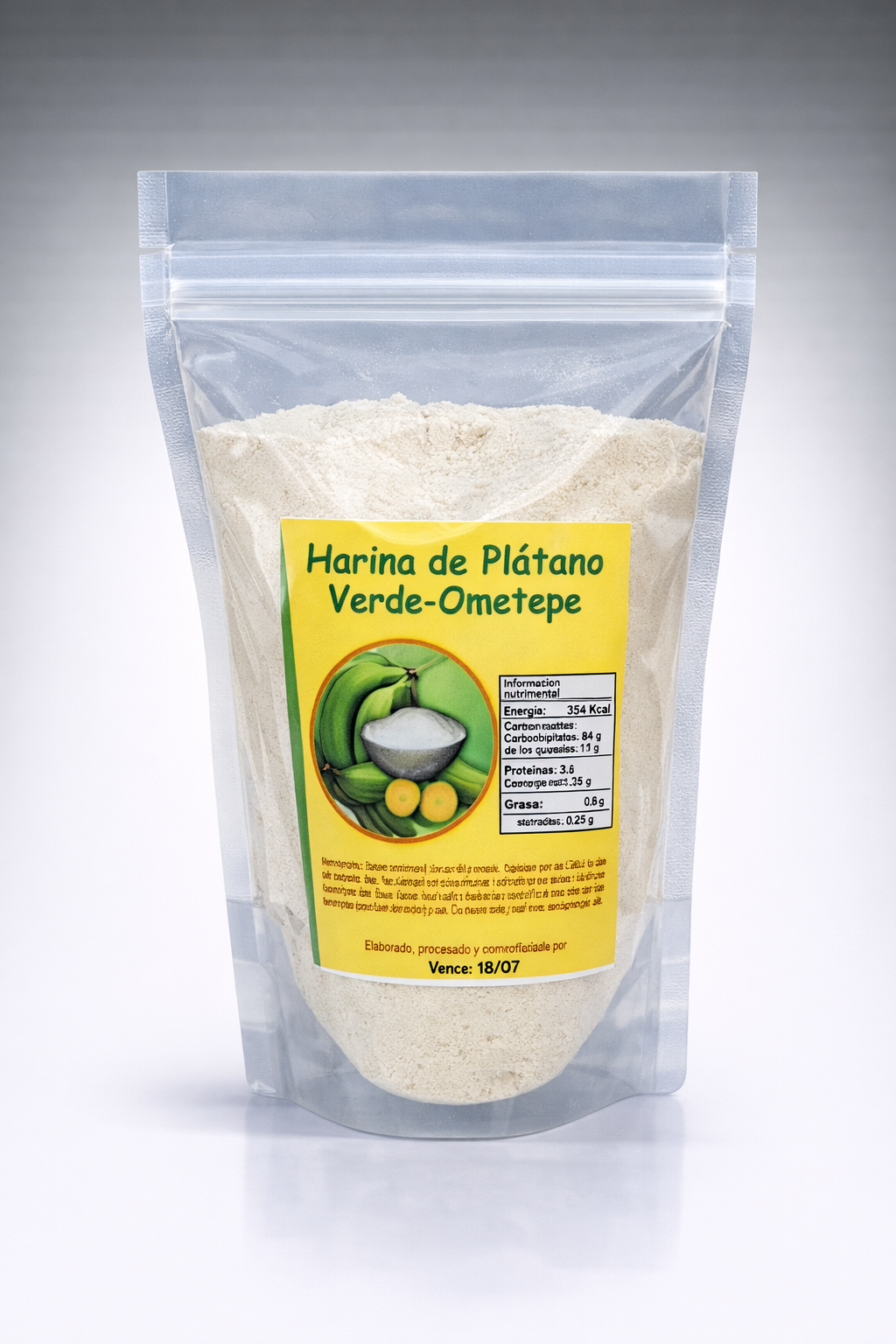 Nuestra harina de plátano es un producto natural elaborado a partir de plátanos seleccionados, deshidratados y molidos de forma artesanal para conservar su sabor y propiedades.